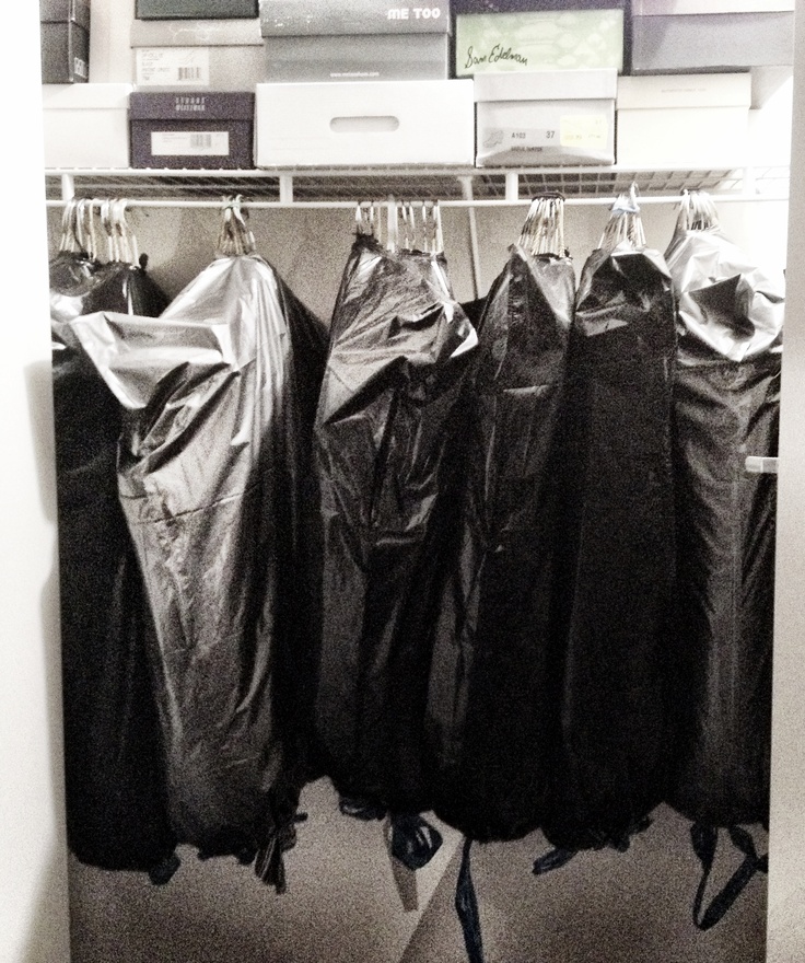 SO MUCH EASIER. Simply cut a hole in the top, and use them as garment bags. I used this technique this past July, and had no ironing as a result!