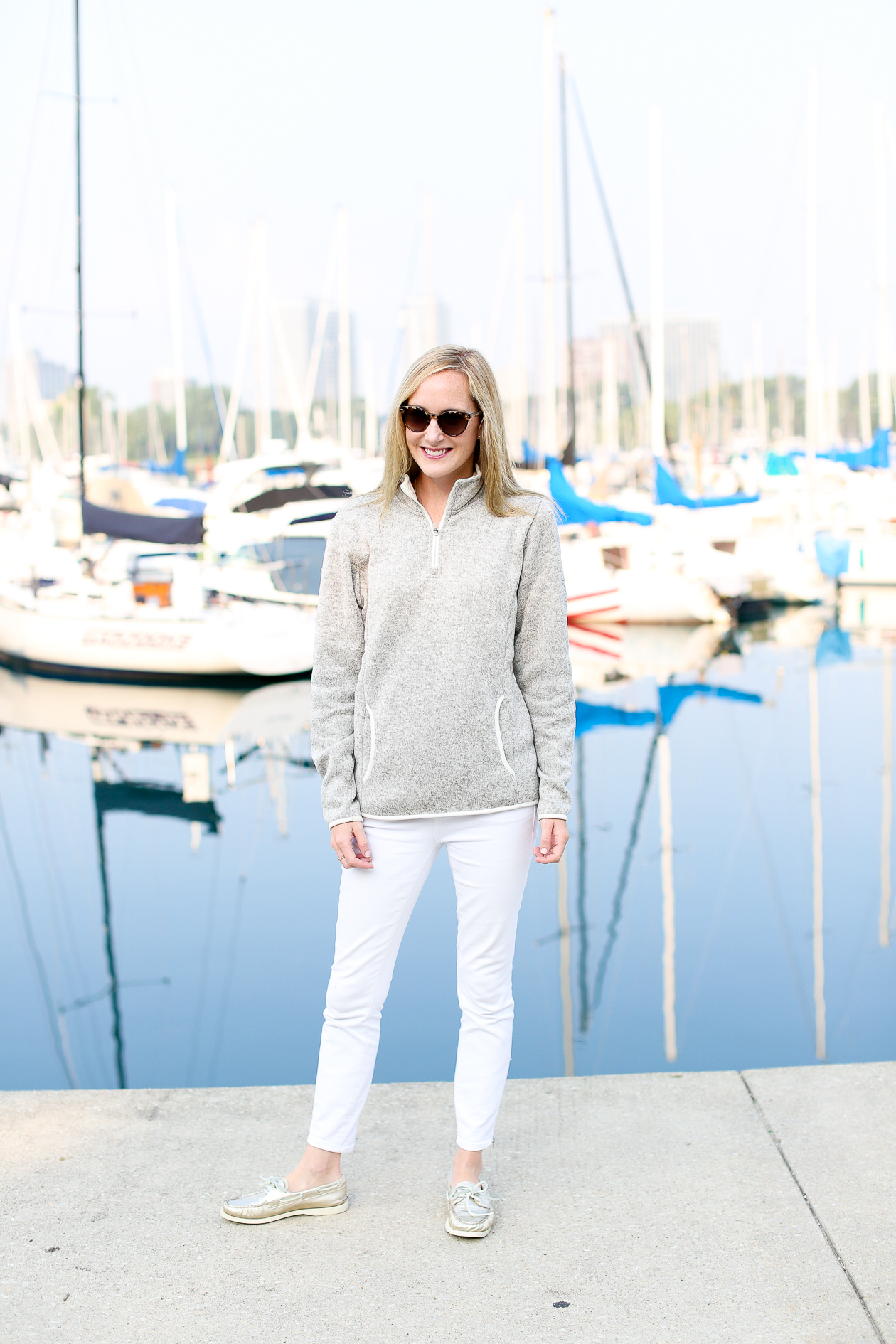 Charles River Apparel Heathered Pullover c/o / Gold Sperrys (Old, similar here, here and here) / Madewell Jeans (Old, similar here) / Kate Spade Sunglasses (Old, similar here and here) and Earrings