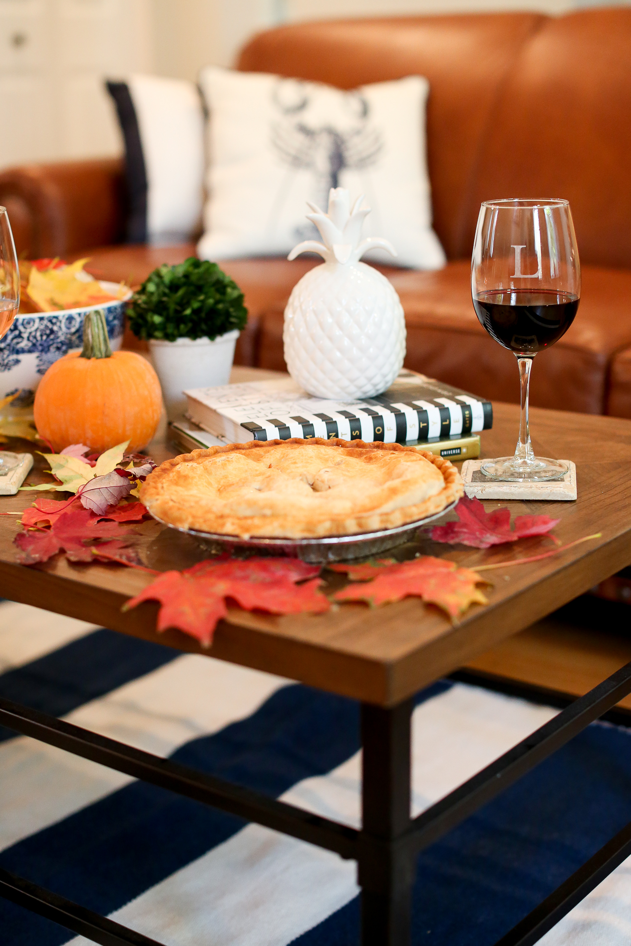 hayneedle Rug, Monogrammed Wine Glasses, Decorative Lighted Pumpkin and Parquet End Table c/o