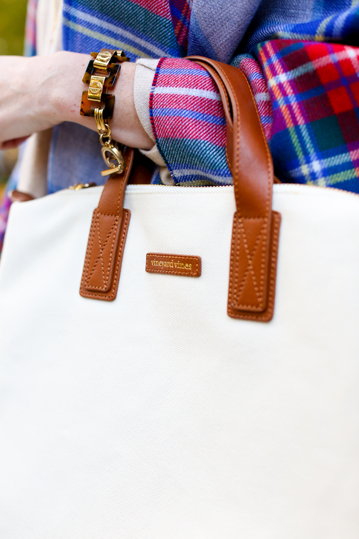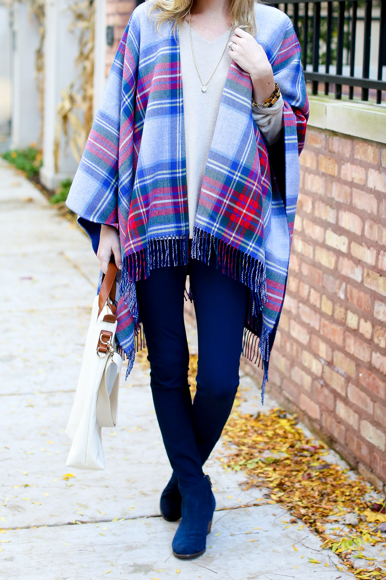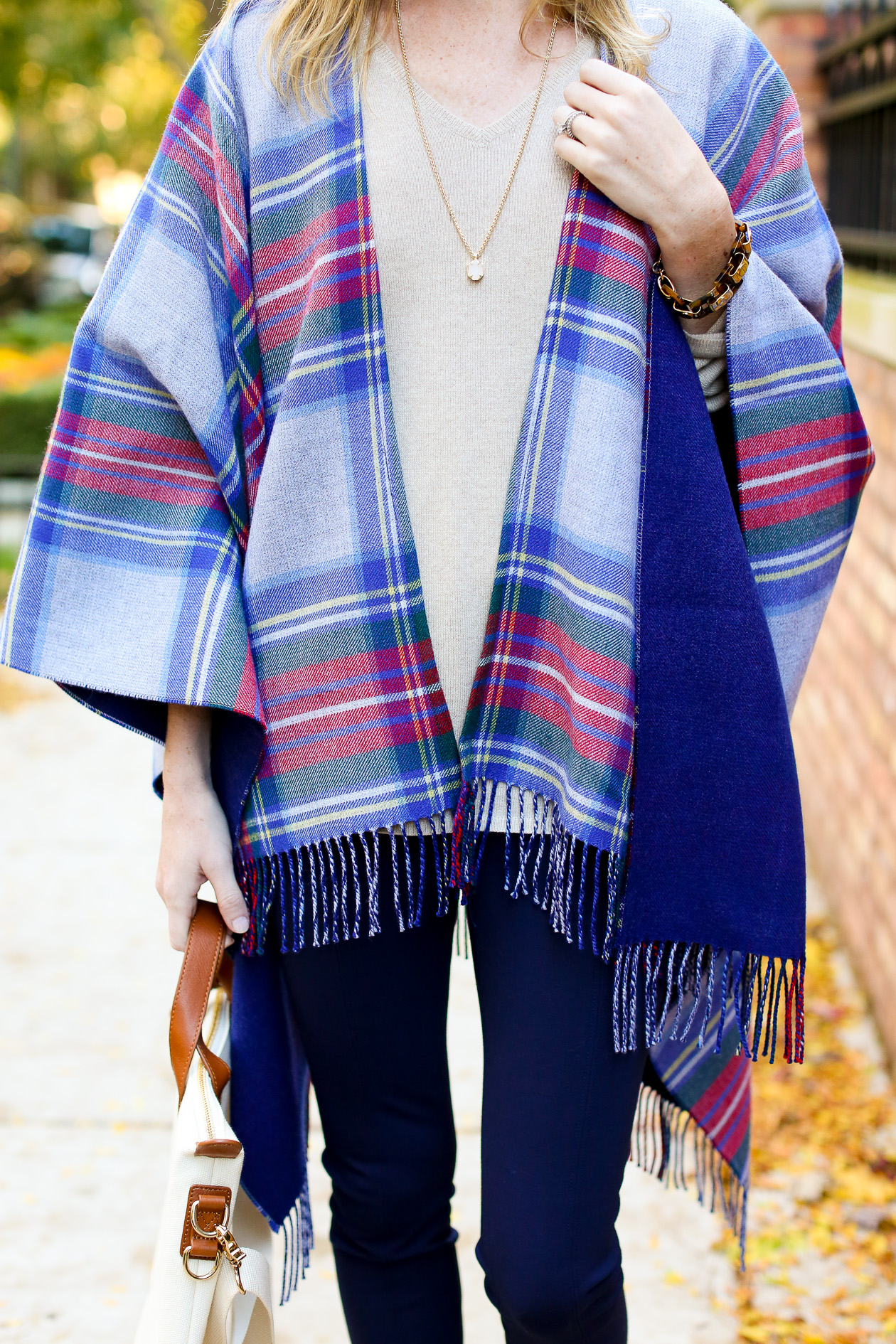 I’m wearing: Vineyard Vines Ponte Pants, Plaid Cape, Canvas Carryall and Cashmere Sweater c/o / Kate Spade Sunglasses (Old, similar here and here) / J.Crew Bracelet / Kendra Scott Necklace and Earrings c/o / Lands’ End Booties c/o (Do we think I wear these enough?!) / C.Wonder Bracelet (Old, similar here, here and here)